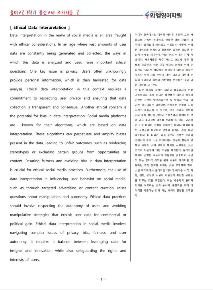 울산여고2 1학기 중간고사 추가지문 무료배포 / 옥동 와엘영어학원