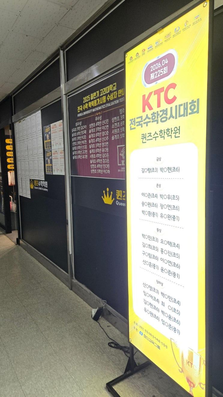 퀸즈수학학원, 또 한 번의 값진 결과를 만들었습니다 안녕하세요, 퀸즈수학학원입니다. 2026년 4월 10일(금), 저희 퀸즈수학학원에서는 한 학기에 두 번 시행되는 KTC 전국수학경시대회를 진행하였습니다. 이번 시험 역시 매쓰프로 수학 문제은행을 기반으로 한 공신력 있는 평가로, 초등부터 중1까지 전 재원생이 참여하였으며 (※ 중2, 중3은 지필평가 대비로 인해 이번 회차는 제외) 아이들이 그동안 얼마나 성실하게 준비해왔는지를 확인할 수 있는 소중한 시간이었습니다. --- 결과보다 더 값진 ‘과정’ 시험을 준비하는 과정 속에서 아이들은 단순한 문제 풀이를 넘어 ✔ 개념을 정확히 이해하고 ✔ 실수를 줄이는 연습을 하며 ✔ 스....... <img src="https://blogthumb.pstatic.net/MjAyNjA0MjdfMjA5/MDAxNzc3MjQxNjM1MzE1.ud7oyQoZ2BFXbMKoWJP-cGXKRb9oBbiRXEnzoMTTXGcg.2QC1pPf0G1bc35X67u2vT9SDN3Su5mPNjw4W_if5z7og.JPEG/900_20260421_215356.jpg?type=s3" />
