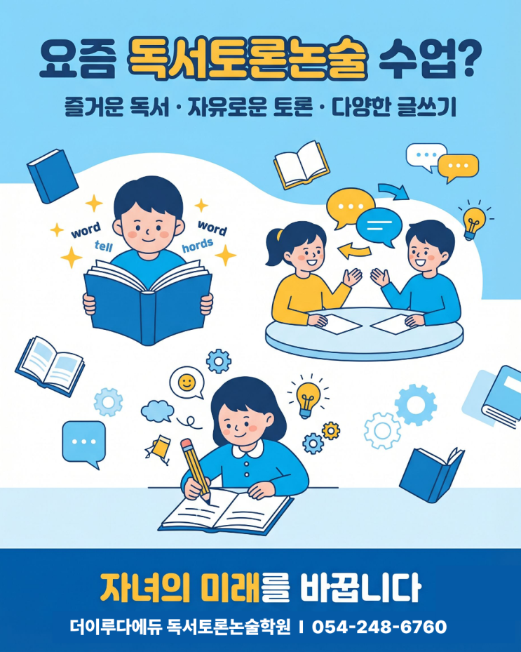 안녕하세요? 더이루다에듀 독서토론논술 학원 입니다 요즘 학부모님들께서 이런 질문을 많이 하십니다. 요즘 독서토론논술 수업은 뭐가 다른가요? 예전처럼 책만 읽고 끝나는 수업이 아니라, 지금의 독서논술은 완전히 달라졌습니다. 즐거운 독서에서 시작합니다 아이들이 독서를 싫어하는 이유는 ‘읽어야 해서’ 읽기 때문입니다. 더이루다에듀는 다릅니다. 흥미 있는 책 생각을 자극하는 이야기 를 통해 읽고 싶어지는 독서를 만들어갑니다. 독서는 공부가 아니라 생각의 시작이기 때문입니다. 자유로운 토론으로 생각이 자랍니다 책을 읽었다면, 이제 생각을 나눕니다. ✔ “왜 그렇게 생각했을까?” ✔ “다른 방법은 없을까....... <img src="https://blogthumb.pstatic.net/MjAyNjA0MjlfMzEg/MDAxNzc3Mzk1Nzk4NDQz.zohZys_wznckIRb5-yJ6UO3U4gOOXrN_mnoxpe3u2WMg.lv3OdyMeOHtGg3-2OTAwhvNLb-B1yhT_gfZRTvxeQGkg.PNG/%C1%A6%B8%F1%C0%BB_%C0%D4%B7%C2%C7%D8%C1%D6%BC%BC%BF%E4._%2881%29.png?type=s3" />