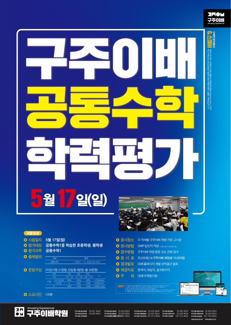 안녕하세요 구주이배 미사본원입니다^^ 5/17(일) 오후 2시 구주이배 공통수학 학력평가를 시행합니다. 구주이배 공통수학 학력평가, 왜 중요할까요? 공통수학1은 고등수학의 출발점으로, 이후 고등수학의 기초가 되는 중요한 과정입니다. 특히 함수의 기본 개념과 구조를 이해하고, 미분과 적분으로 이어지는 기반을 형성합니다. 따라서 고등 입학 전 공통수학1의 학습 완성도를 높여야 내신 시험에서 자신의 실력을 제대로 발휘할 수 있습니다. 이에 구주이배에서는 공통수학1 학습 상황을 객관적으로 점검하고, 앞으로의 학습 방향을 설계할 수 있도록 <구주이배 공통수학 학력평가>를 시행합니다! < 시행안내 > 일시 : 2026년....... <img src="https://blogthumb.pstatic.net/MjAyNjA0MjBfMjAg/MDAxNzc2NjY1MTA0MDQ1.ynd_A8RQY7-3RD7UG_wohv0AeMi_iR2RC5ViAum3MUgg.ZcAd_2mxGOqo0lt18eL3875QghTIWKBeAwF4eW_uvngg.PNG/260517_%B0%F8%C5%EB%BC%F6%C7%D0_%C7%D0%B7%C2%C6%F2%B0%A1.png?type=s3" />