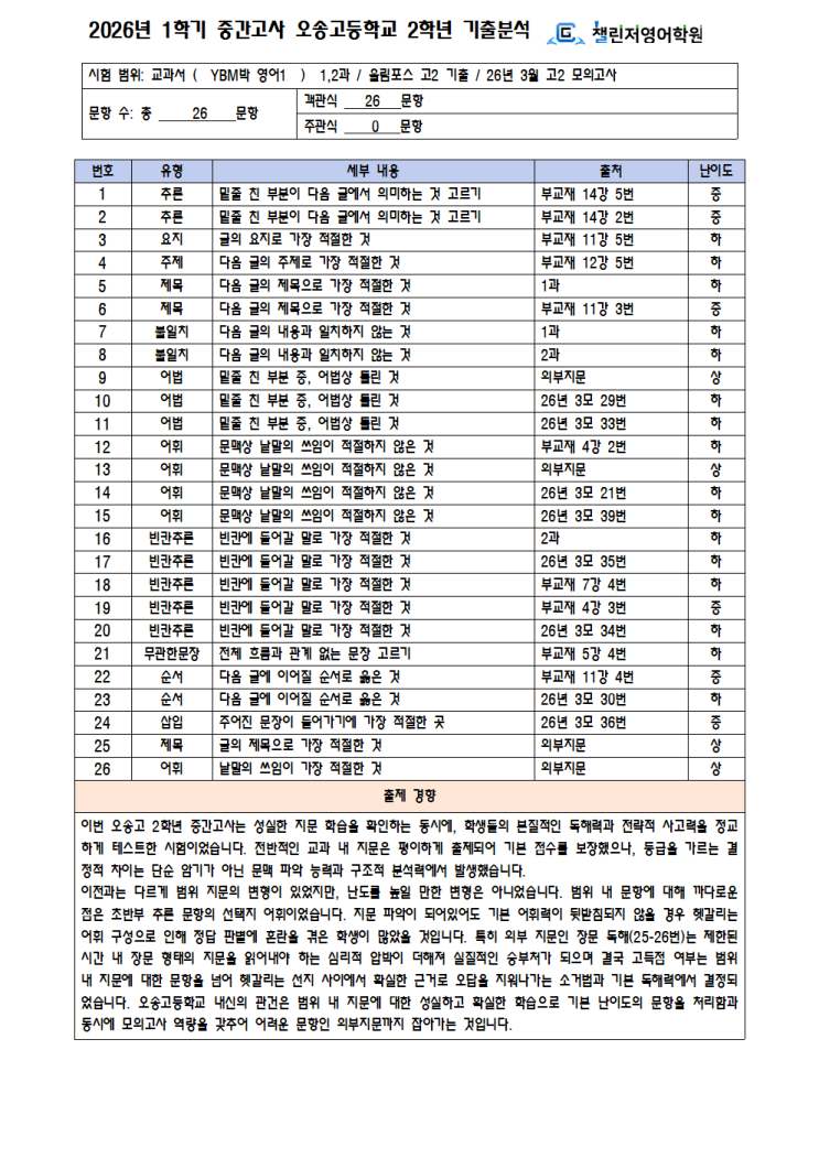 26년 오송고 2학년 1학기 중간고사 기출분석