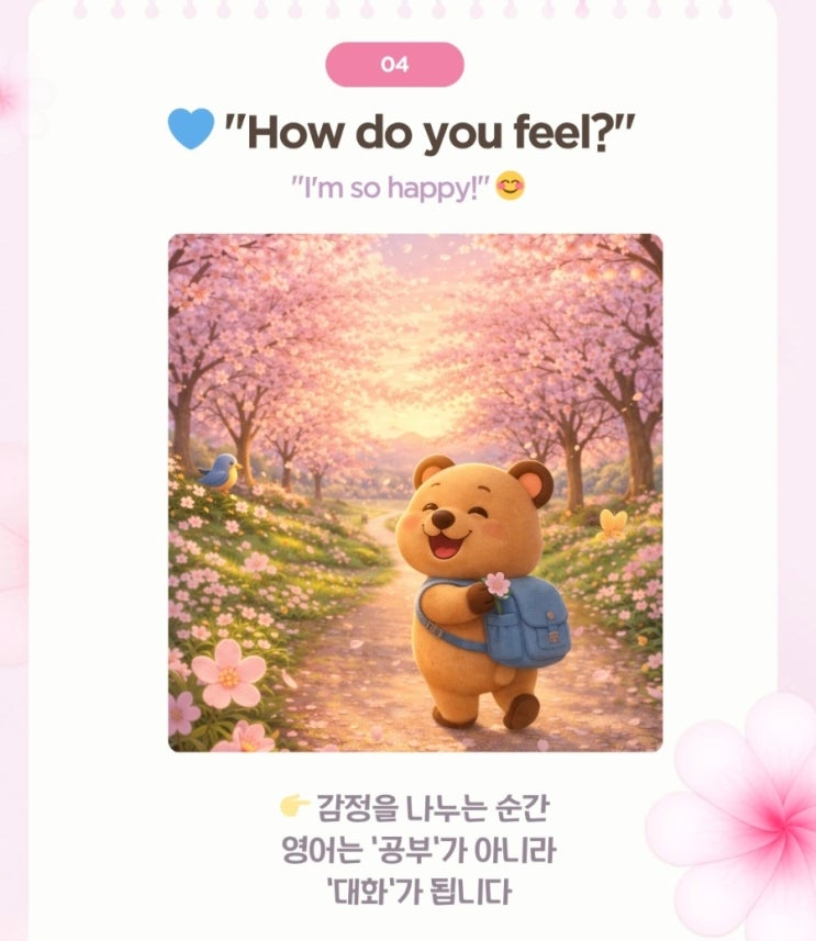 안녕하세요 구미링키영어 씽크랩 송정센터 Celine입니다. 일년 중 가장~~~~ 마음이 설레는 봄봄봄~~~ 만끽하고 계시나용?^^ 금방 또 무더운 여름이 찾아오겠죠? 흑흑 요즘 아이들과 봄나들이 많이들 가시죠? 그래서 준비했어요! 아이들과 자연스럽게 주고 받을 수 있는 영어표현 5가지!! Look at the pretty flowers! (예쁜 꽃들 좀 봐!) 길을 걷다가 예쁜~~꽃들을 보면 손으로 가르키며 색깔을 덧붙여! 해보세요~~~ 따듯한 봄 햇살을 맞으며 아이들과 공원을 산책할때~~ 여행중일때~~ 그 분위기를 느끼며 말해주세요~~! 아이들은 약간 과장해주면 훨~~씬 더 집중해서 들으려해요! 꽃냄새를 킁킁킁~~~오버해서 맡으며 말해보셔요~~ㅎㅎ 소풍에서....... <img src="https://blogthumb.pstatic.net/MjAyNjA0MThfMTkg/MDAxNzc2NDM4Mzc4MDU1.sZ5fvcskDPXN_tZeIshunIZnXyo6J_VvvDOFN542frQg._i5mpTHimr95oB4upi2OpWqK0tzP5DeRZx3oWDwtGBIg.JPEG/900_Screenshot_20260415_215240_Instagram.jpg?type=s3" />