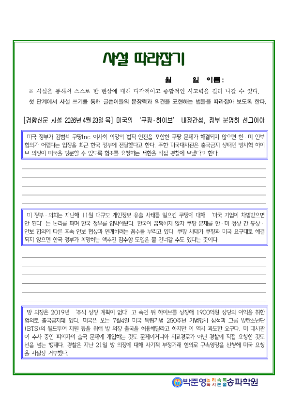 2026년 4월 23일 사설 과제입니다. 첨부 파일 확인바랍니다. <img src="https://blogthumb.pstatic.net/MjAyNjA0MjNfMjEz/MDAxNzc2OTA2OTkwNjIw.CzCQzaj9fc8CAZ-pKP5WOsp3yUMBtSTC69unAFpoF5Eg.V_6VLMhNCCHszyRNES5c77SpvNl6REpG8RY-pXgem4kg.GIF/01.gif?type=s3" />