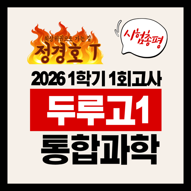 두루고 1학년 통합과학 정경호T클래스 시험 분석 및 성취 결과 두루고등학교 1학년 학생들의 첫 통합과학 시험이 마무리 되었습니다. 처음 치르는 고등학교 과학 내신 시험이었던 만큼, 학생들에게도 부담이 컸을 텐데요, 끝까지 성실하게 준비해 온 우리 학생들에게 먼저 큰 박수를 보내고 싶습니다. 이번 글에서는 2026학년도 두루고 1학년 1학기 1회고사 통합과학 시험의 출제 경향과 함께, 수능을담다학원 정경호T 수강생들의 성취 결과를 정리해 드리겠습니다. 이번 두루고 통합과학 시험의 출제 경향 이번 두루고 1학년 통합과학 시험은 전반적으로 기초 개념 확인과 기본 적용 문제가 중심이었습니다. 복잡한 사고력을 요구하는 고난도 문....... <img src="https://blogthumb.pstatic.net/MjAyNjA0MjVfMjk0/MDAxNzc3MDQ0MTQ0MTY2.alKZWPfaYLVhL0t-Nic0xpHpegivU_HC6gbVqX-WcOwg.mgmwA31LLjKUCM5vIAUjsxRP0brIheAivTD7fA5Hdvog.PNG/1.png?type=s3" />