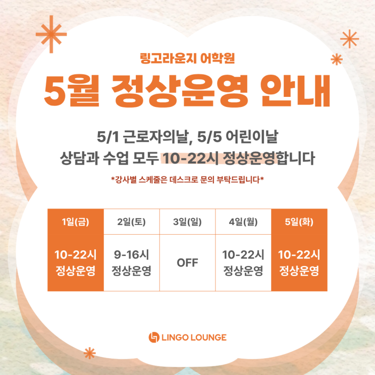 안녕하세요, 성인 일대일 외국어 회화 전문 링고라운지 어학원입니다. 5/1 금요일 근로자의날, 5/5 화요일 어린이날 10-22시 정상운영합니다! (강사별 스케줄은 상이할 수 있습니다.) 이용에 참고 부탁드리며 행복한 가정의 달 보내시길 바랍니다 실력과 결과로 증명하는 링고라운지 어학원입니다. 링고라운지 어학원 주소: 경기도 수원시 영통구 영통동 덕영대로 1505, 10층 전화: 031-211-2510 카카오톡: lingolounge 링고라운지 어학원의 모든 수업은 비대면(화상)으로 수강이 가능합니다. 감사합니다! <img src="https://blogthumb.pstatic.net/MjAyNjA0MjdfMTE4/MDAxNzc3MjYwODU0MDM2.ujJjVZ6_uwXNo-kGaaT_SQyEIFRPJemr728LtgEoCgIg.zOmYHaeZ6Y8ER1weMFWF_CjVyoMFsayHvTQ123l51Kwg.PNG/%C1%A6%B8%F1%C0%BB_%C0%D4%B7%C2%C7%D8%C1%D6%BC%BC%BF%E4..png?type=s3" />