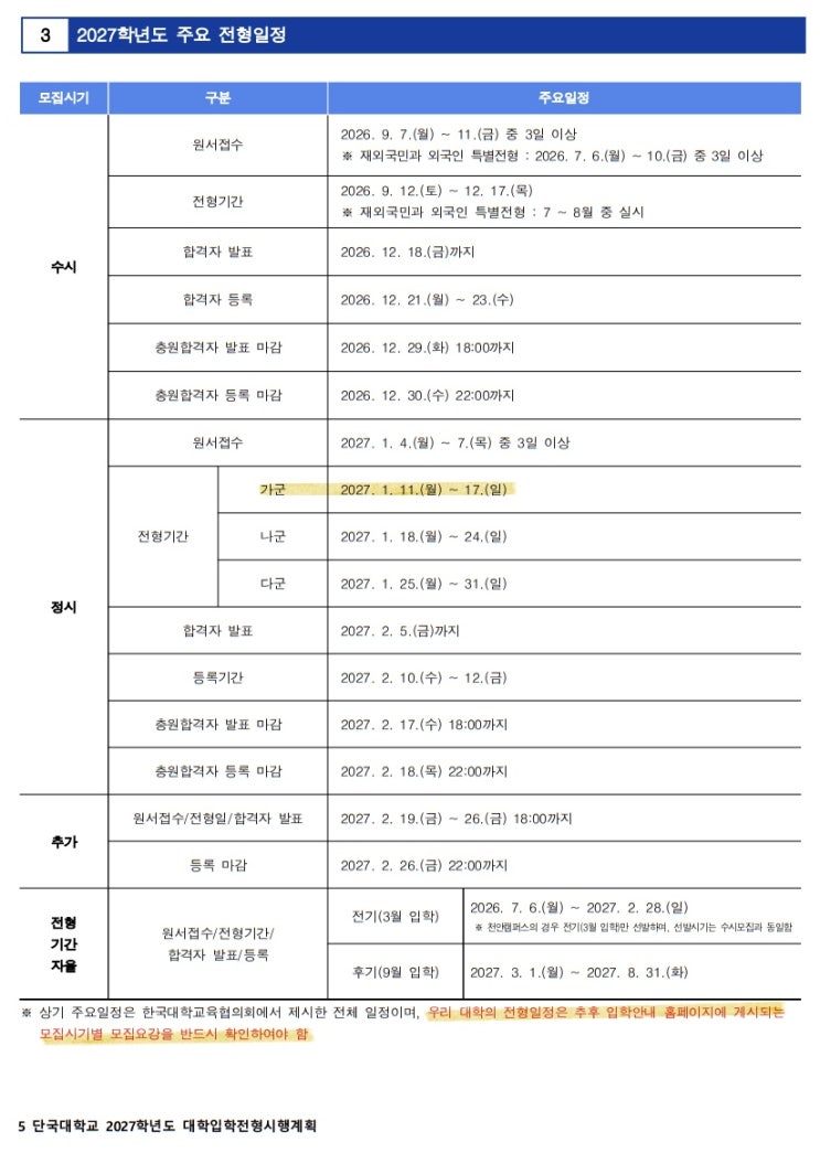 단국대학교의 2027학년도 모집요강이 발표되었습니다. 함께 알아볼까요? 모집 단위 및 모집인원 연극전공 수시 14명 정시 6명 뮤지컬전공 7명 정시5명 수시 원서접수 2026.09.7(월)-9.11(금) 중 3일 이상 전형기간 2026. 9. 12.(토) ~ 12. 17.(목) 정시 원서접수 2027. 1. 4.(월) ~ 7.(목) 중 3일 이상 전형기간 가군 2027. 1. 11.(월) ~ 17.(일) 추가 원서접수/전형일/합격자 발표 2027. 2. 19.(금) ~ 26.(금) 18:00까지 등록 마감 2027. 2. 26.(금) 22:00까지 전형별 세부사항 실기/실적위주 [실기우수자] - 연극전공(연기) 일괄합산 [실기 80% + 교과 15%+ 비교과(출결) 5%] - 뮤지컬전공(연기) 1단계(5배수) [실기 100%] 2단계 실기 80% + 교....... <img src="https://blogthumb.pstatic.net/MjAyNjA0MjRfMTI3/MDAxNzc3MDMzNzI1MTA2.6QSranBWYP4pGs38NLZwlBrvLxd-ZMkNbG4CopLZBpAg.2d0hoofEL2HFHdvt5qpRk5F_Em4mddciMt9l8DUUFaYg.JPEG/KakaoTalk_20260424_211316813_08.jpg?type=s3" />