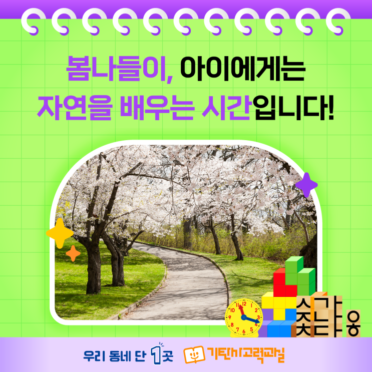 봄은 아이와 함께 바깥으로 나가기 참 좋은 계절입니다. 햇살은 따뜻해지고, 바람은 부드러워지고, 곳곳에 자연의 변화가 선명하게 드러납니다. 그래서 많은 부모님들이 이 시기, 아이와 함께할 봄나들이를 계획하게 됩니다. 그런데 봄나들이를 준비할 때 한 가지 더 생각해 보면 좋겠습니다. 어디를 가느냐도 중요하지만, 그곳에서 아이가 무엇을 보고, 느끼고, 경험하느냐는 더 중요합니다. 아이에게 봄은 단순한 계절이 아닙니다. 꽃의 색을 발견하고, 흙의 냄새를 맡고, 바람의 움직임을 느끼며 세상을 배우는 시간입니다. 그래서 봄나들이는 단순한 외출이 아니라, 아이의 오감을 깨우고, 스스로 세상을 탐색하게 만드는 살아 있는 배움의 시....... <img src="https://blogthumb.pstatic.net/MjAyNjA0MTZfMjgg/MDAxNzc2MzA2OTY5NDgw.arTtrblWm8MyIbW7rBnkntQXYmhd98_jKtD9W5w7Mewg.WM-nm5Eny2RuTPrUqxJoD8phbhUGodimtGv0MN188aUg.PNG/1.png?type=s3" />