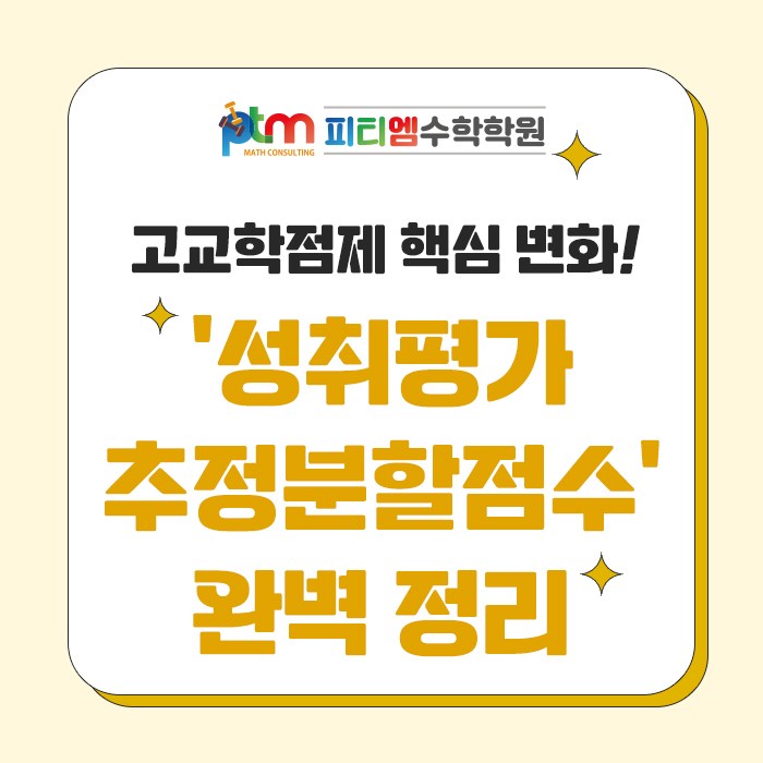 안녕하세요, 학부모님들 최근 고교학점제와 관련해 꼭 알고 계셔야 할 중요한 평가 변화가 발표되었어요. 바로 '성취평가 추정분할점수'인데요. 단순한 평가 방식 변화가 아니라, 앞으로 우리 아이 내신 전략과 대입 경쟁력에 직접적인 영향을 주는 핵심 요소이기 때문에 정확히 이해하셔야 해요. 오늘은 학부모님 입장에서 꼭 필요한 내용만 쉽고 핵심적으로 정리해드릴게요. ✔️ 고교학점제 핵심: '성취평가'란 무엇인가요? 고등학교 성취평가는 기존처럼 상대평가(등수 경쟁)가 아니라 정해진 기준에 얼마나 도달했는지 평가하는 절대평가 방식이에요. 성취도: A / B / C / D / E (5단계) 핵심: "다른 학생보....... <img src="https://blogthumb.pstatic.net/MjAyNjA0MjhfMTM0/MDAxNzc3Mzc4MTY3NjUw.uHWKMyAsb3cWq3sbrdKN8TjLo4jlQuSFmEuAXQDA1vcg.2XMK0wFQGFl9HUnfRbMGlGIpYU-Mta-NktwTc61MZn8g.JPEG/%BC%BA%C3%EB%C6%F2%B0%A1%BA%D0%C7%D2%C1%A1%BC%F6_%B8%DE%C0%CE.jpg?type=s3" />