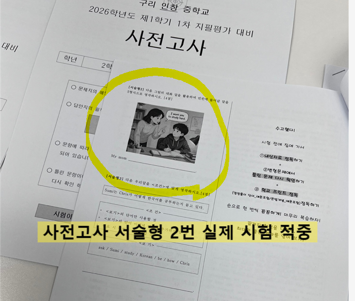 안녕하세요 그루영어학원입니다. 26년 1학기 1차 지필평가인 인창중2 중간고사 논술형에서도 그루영어학원의 정확한 시험 예측이 다시 한번 적중했습니다. 그루영어학원 인창중2 중간고사 논술형 적중 분석 학원에서 시험 전날에 본 사전고사에 출제한 문제의 답 My mom wants me to study hard. 실제 학교 시험 문제의 답은 Amy’s mom wants her to clean the room. 목적어, 동사 표현만 달라졌을 뿐, 핵심 평가 요소는 완전히 동일합니다. 인창중 전문학원 그루영어학원만의 철저한 내신 분석에 따른 예상문제 제작 과정 ① 2025학년도(전년도) 인창중2 논술형 출제 스타일 반영 - 현재시제 활용 및 주어&동사 수일치 평가 - 그림의 상황....... <img src="https://blogthumb.pstatic.net/MjAyNjA0MjhfNDQg/MDAxNzc3MzU0NzMxMTYw.czRwkHTZUOVw_b53CjjfyxiFv8Cfgk99QGA9BF72AYsg.qpufTB4vLoVj9XmwZkiU3LLtYkf72XxdzWtBVZyRDH0g.PNG/image.png?type=s3" />
