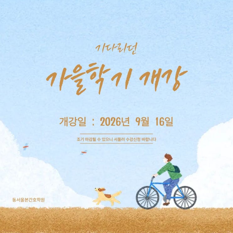 5월 주간반이 조기 마감되면서 뒤늦게 참여를 알아보는 분들께 얼마나 죄송한 요즘인지 모릅니다. 누군가에겐 미래에 대한 준비이고 계획이고 그에 맞춰 시간을 조율하셨을텐데 예기치 못한 상황으로 인해 모든 계획을 수정한다는 것이 쉽지 않을 것임을 알기 때문입니다. 저희야 '죄송합니다' 한 마디지만 그 안에 담긴 마음은 절대 가벼울 수 없는 것 같습니다. 그래도! 최선이 아니면 차선을 위해서라도 저희는 다음을 준비해보려 합니다. 이른감이 없지 않지만 본격적인 가을 준비를 시작한 동서울본간호학원입니다. 26년 가을학기 첫 번째 주간반의 개강일은 9월 16일입니다. 26년 9월 16일에 시작해 27년 9월 7일까지로 예정되어....... <img src="https://blogthumb.pstatic.net/MjAyNjA0MjNfMjM0/MDAxNzc2OTE5NjAwNzc5.MNc-hqzV0YDDSOFyHkxcdZAtWljWES8_lavqwLAbqV8g.Ase_2GdrRCKkrv-QskGPhmET03OXDnqbiaMUkz83eP0g.JPEG/26.9.16%B1%E2%B4%D9%B8%AE%B4%F8_%B0%A1%C0%BB%C7%D0%B1%E2_%B0%B3%B0%AD.jpg?type=s3" />