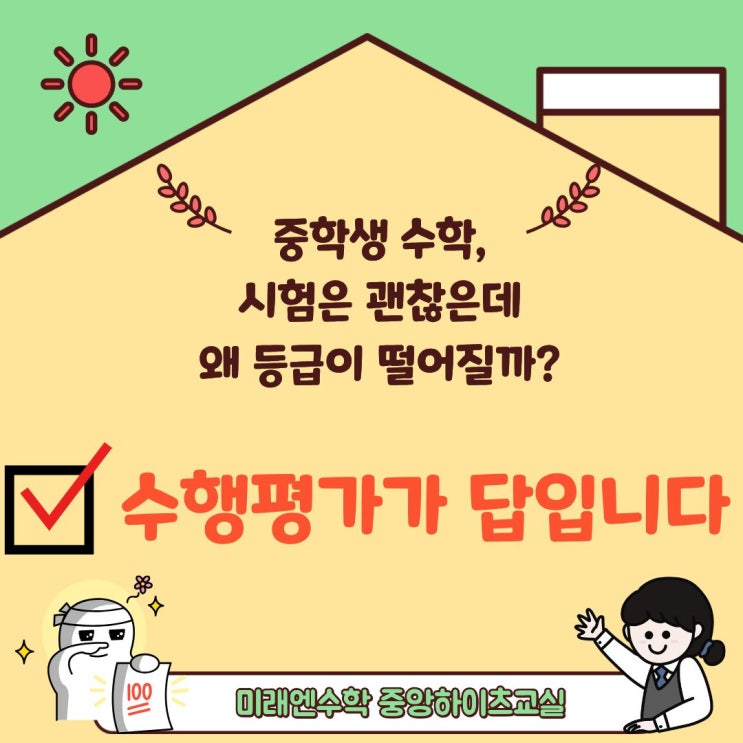 안녕하세요 미래엔수학 중앙하이츠교실 미래쌤입니다. 율하 중학생 친구들, 이번 중간고사 정말 고생 많았어요. 시험 끝나고 잠깐은 쉬고 싶죠. 그런데요… 아직 중요한 한 가지가 남아 있습니다. 바로 수학 수행평가입니다. 이런 고민, 해보신 적 있으실까요? “시험 점수는 괜찮은데 왜 등급이 생각보다 낮지?” 학부모님들과 상담을 하다 보면 정말 자주 듣는 이야기입니다. 이 경우 대부분의 원인은 바로 수행평가 점수에서 나옵니다. 요즘 수학 평가, 많이 달라졌어요 예전에는 시험 점수가 거의 전부였다면 지금은 조금 다릅니다. 단순히 문제를 맞히는 것이 아니라 ✔ 얼마나 이해했는지 ✔ 어떻게 설명하는지 이 과정까지 함께....... <img src="https://blogthumb.pstatic.net/MjAyNjA0MjhfMTI1/MDAxNzc3MzQ4MDk4ODc1.R8WPUehIjcU6g4g2IhqmItLjRj01nS2aM24fDz-cd98g.YWQHwqcFNH2PM4Rzzp4FSg5cOFR4Bsw-NadDgyu_jqEg.JPEG/%C1%A6%B8%F1%C0%BB_%C0%D4%B7%C2%C7%D8%C1%D6%BC%BC%BF%E4._%283%29.jpg?type=s3" />