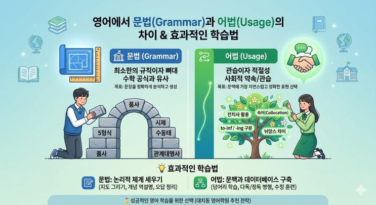 안녕하세요? '대치동 영어학원'으로 좋은 추천을 받고 있는 『족집게어학원』입니다. 많은 학생과 학부모님들이 영어 공부를 하면서 가장 혼란스러워하는 부분 중 하나가 바로 문법(grammar)과 어법(usage)의 차이입니다. 단순히 '영어를 잘하고 싶다'는 마음으로 문제집을 풀기보다는 이 두 개념의 본질적인 차이를 이해하고 접근해야 전략적인 학습이 가능합니다. 특히, 교육의 중심지에서 강남 대치동 영어학원을 찾는 분들이라면, 단순 암기를 넘어선 논리적 접근의 중요성을 이미 체감하고 계실 것입니다. 문법(grammar)이란 무엇인가? 문법은 언어가 구성되는 '최소한의 규칙'이자 '뼈대'입니다. ....... <img src="https://blogthumb.pstatic.net/MjAyNjA0MjZfMjk3/MDAxNzc3MTcxMTMxODk2._4-HUYT1indubdzZDwihsaN0wbz2Xf-5TOmmc29zKl8g.SiJyHAi6FLjstrL2XA81U_HyfblchOYnCVmaMv_wrPkg.PNG/%C5%E4%C7%C3%C7%FC%B9%AE%C1%A6_%C0%CC%B9%CC%C1%F612.png?type=s3" />