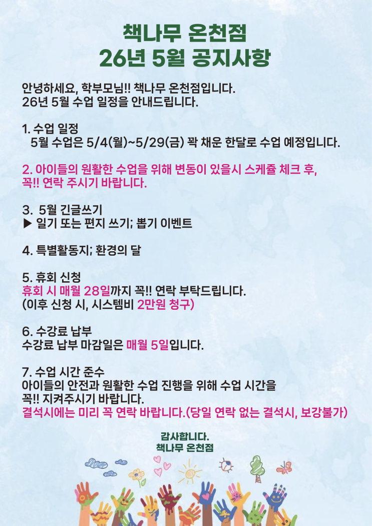 안녕하세요, 학부모님 책나무 온천점입니다. 5월 수업 일정을 안내드립니다. 1. 수업 일정 5월 수업: 5/4(월) ~ 5/29(금) →꽉 채운 한달로 진행 됩니다. 2. 일정 변경 시 아이들의 원활한 수업을 위해 변동 사항이 있을 경우 사전 연락 부탁드립니다. 3. 5월 글쓰기 활동 일기 또는 편지 쓰기 뽑기 이벤트 진행 4. 특별 활동 환경의 달 활동 진행 5. 휴회 신청 매월 28일까지 신청 필수 이후 신청 시 시스템비 2만원 발생 6. 수강료 납부 납부 마감: 매월 5일 7. 수업 시간 준수 아이들의 안전과 원활한 수업을 위해 수업 시간을 꼭 지켜주세요. ※ 결석 시 사전 연락 필수 (당일 무단 결석 시 보강 불가) 감사합니다. 책나....... <img src="https://blogthumb.pstatic.net/MjAyNjA0MjhfMjAw/MDAxNzc3Mzg1NzE5Nzc0.VFYhzQpmW0mdN3oNTmvlFU4nWlzg4eFxnCXmJTi4b3Ig.ijaBXc2_5aPULErLk5LMwi_apwzev-hrUEdGoxT6Q7Mg.PNG/KakaoTalk_20260423_221917020.png?type=s3" />