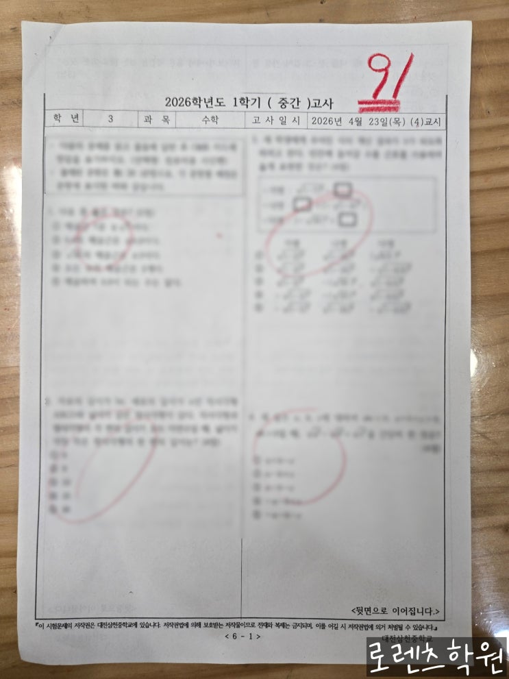 안녕하세요 대전 둔산동 수학 과학 전문 로렌츠학원입니다. 이번 주 삼천중학교에서 1학기 중간고사 시험을 모두 마쳤습니다. 시험을 마치고 나온 아이들의 가장 큰 불만은 바로 '시간이 너무 부족했다'는 것이었습니다. 이번 시험에서 우리 아이가 평소보다 점수가 많이 떨어졌거나 아는 문제도 다 풀지 못하고 찍었다면, 이번 기출 분석과 로렌츠학원의 학습 전략을 반드시 확인해 보시기 바랍니다. 삼천중 3학년 중간고사 출제 경향 분석 이번 삼천중 3학년 수학 시험은 총 26문항으로 구성되었습니다. 인근 중학교들이 그러하듯이 모두 객관식으로만 출제되었지만 단순 계산을 넘어 정확한 개념 이해와 여러 조건을 동시에 해석해....... <img src="https://blogthumb.pstatic.net/MjAyNjA0MjVfMTY3/MDAxNzc3MTExNDQ4MjU4.bjDaE1XBusjcDYRPr6KRSQ8MdxBVUPRf5tjnymfwwmEg.in1ZLUuxPR1twbgDBafqSIoQTI7Ak4cc_o5QIaDcphEg.JPEG/KakaoTalk_20260425_180942542.jpg?type=s3" />