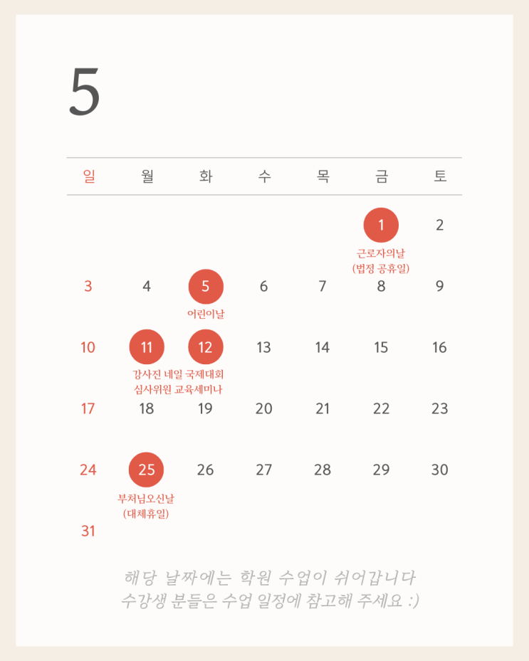 안녕하세요~ #울산네일전문학원 #여_울산네일전문학원 입니다♡ 어느새 4월의 끝이네요 >0< 시간이 너무 빨리 지나가요 .... ㅜㅜ 남은 4월도 모두 잘 마무리하시고 행복한 5월 시작해 보아요 ♪ 5월 휴강 일정이 있어서 알려드립니다 수강생분들과, 상담문의는 일정 조율에 참고 부탁드려요♥ 5월은 가정의 달이어서 그런지 행사도 많고 쉬는 날도 많네요 ㅎㅎ 날씨도 따듯해져서 외출하기도 너무 좋은 거 같아요 ♥ ※ 휴강기간에도 문자/카톡으로 문의는 남겨주실 수 있어요. 확인되는대로 빠르게 안내드리겠습니다 여:울산네일전문학원엔 새로이 네일샵 창업 준비를 위해서도 많이 배우러 오시지만 예전에 배우셨다가 다시 배울 학원으....... <img src="https://blogthumb.pstatic.net/MjAyNjA0MjlfMjM1/MDAxNzc3NDMyOTc2MzEy.WDxsB_kmHKvUGqtau_zbhyQSJG9NmQ1g5i4kAjFPHlcg.z6oh5yNnys8656-0VZpl1_OXuoiIAlqGAY6fv6Ddfecg.PNG/%BA%A3%C0%CC%C1%F6%BB%F6_%B1%F2%B2%FB%C7%D1_%B9%CC%B4%CF%B8%D6%B8%AE%C1%F2_5%BF%F9_%B4%DE%B7%C2_%C8%DE%B9%AB_%C0%CE%BD%BA%C5%B8%B1%D7%B7%A5_%B0%D4%BD%C3%B9%B0_%281%29.png?type=s3" />