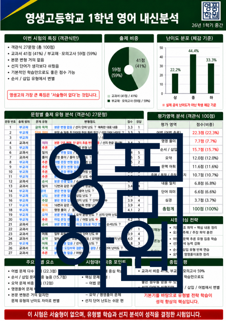 안녕하세요 영어전문 영품학원입니다. 2026년 1학년 1학기 영생고 영어 중간고사에 대한 분석 및 총평 그리고 시험 일치도를 일부 공유해 드립니다. 정확한 정보는 상담 시 공개가 가능한 점 이해 부탁드립니다. 총 평 2026년 1학기 중간고사에서 영생고는 교과서 **점, 부교재 **점의 비율로 출제가 되었습니다. 영생고만의 특징이 잘 드러나는 시험이었습니다. 가장 먼저 눈에 띄는 점은 올클이라고 하는 어법 부교재가 따로 있고 이 교재에 나오는 단일 문장 어법 시험을 3문제를 낸다는 것입니다. 학생들에게 부족한 분야별 어법을 집중 연습 시키려는 의도가 보입니다. 한 문장안에서 어법적으로 맞는 것을 고르는 문제이다 보니 구문 구조....... <img src="https://blogthumb.pstatic.net/MjAyNjA0MjdfMjk4/MDAxNzc3Mjg0NDE5NTc3.I7P0iqaoKE6LLweoLeYvOuKVxyeik5LDEvOPhW5gx4Eg.8PDGvI8Kime-5CaHaiZ6MCkhMNRsUxomYpr1q0fqGU0g.PNG/image.png?type=s3" />