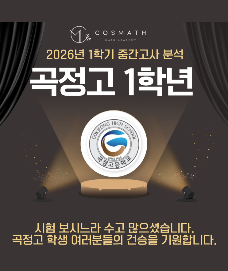 안녕하세요 코스매쓰 수학학원입니다. 4월 23일에는 곡정고 1학년 1학기 중간고사가 치뤄졌습니다. 최근 점점 난이도가 어려워지고 있는 곡정고인만큼 사실 저희 학원에서 또한 학생들과 더욱 신경써서 준비를 했던 학교인데요 이번 곡정고 시험 과연 어떻게 출제되었을까요? 기본기는 빠르게, 변별력 문항은 논리적으로 사실 이번 곡정고 시험 난이도는 학원에서 평가하기는 다소 평이한 난이도로 출제가 되지 않았나 조심스럽게 예측해봅니다만 학생들의 체감난이도는 많이 어려웠다고 합니다. 실제 곡정고는 단순 계산을 반복하는 문항보다는 개념을 적절히 응용하고 논리적인 사고를 요하는 문항들이 문제 후반부에 많이 배치되는 학교인데, ....... <img src="https://blogthumb.pstatic.net/MjAyNjA0MjZfMTY5/MDAxNzc3MjA4MjYwMzQ2.CBlX6coBSsIUvK4ztdb0kOi8fgaKDYdWel47BKQic4sg.KMpCeNbYZIGMCgEXv9b8dtV-fhmq4j-h6MxTu4CWSIIg.PNG/%BA%ED%B7%CE%B1%D7-_-%B1%E2%C3%E2%BA%D0%BC%AE-014.png?type=s3" />