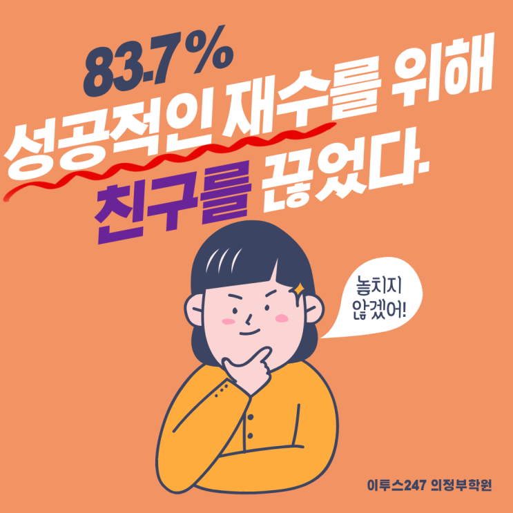 안녕하세요 :) 이투스247 의정부학원입니다! 대입을 준비하는 학생들에게는 정말 많은 유혹들이 있을 것 같습니다. 여가생활, 친구, 잠 등등 굉장한 유혹들이 수험생분들을 괴롭히기도 합니다. 그래서 오늘은 여러분들의 유혹을 떨칠 수 있도록 도움을 주는 흥미로운 설문조사 결과를 준비해 보았는데요, 함께 살펴볼까요? 진학사 입시전략연구소가 수능 성적 향상을 경험한 재수생 842명을 조사한 결과, 이들이 공통적으로 한 일은 '더 열심히 하겠다는 다짐'이 아니었습니다. 그들은 공부하지 않을 수 없는 환경을 먼저 만들었습니다. 10명 중 8명이 친구관계를 끊거나 최소화 했고, 만남을 줄인 것이 아닌 공부 외 관계 자체를 재계....... <img src="https://blogthumb.pstatic.net/MjAyNjA0MjVfMTY2/MDAxNzc3MDc4NjcxMTMy.k2fiE8RKGuEH-R9NbSq9RBCADBqInQr62wpTLLBCnCsg.4Cz1ZF0RXuee0Jaxe5sVUpqFWlEsCg0I8A9qD4du5sMg.PNG/%C1%A6%B8%F1%C0%BB_%C0%D4%B7%C2%C7%D8%C1%D6%BC%BC%BF%E4..png?type=s3" />