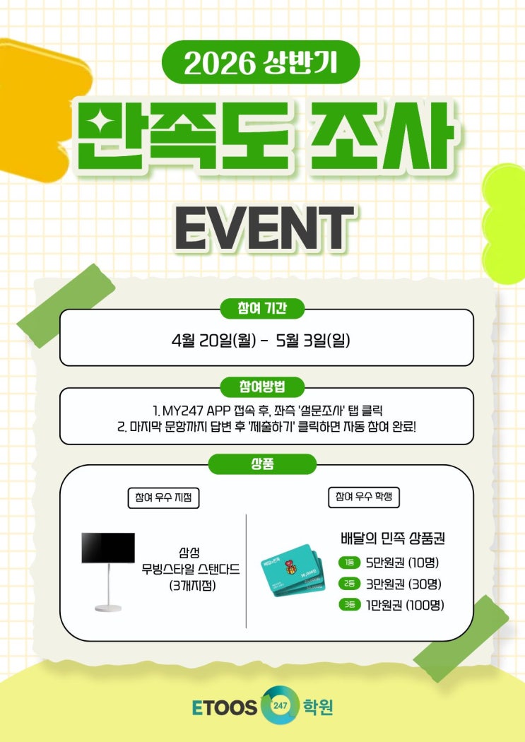 안녕하세요, 이투스247광명점입니다 2026 상반기 재원생 만족도 조사 안내 4월 20일(월) 오전 9시부터 5월 3일(일) 까지 이투스247학원 재원생 대상 2026 상반기 만족도 조사가 진행됩니다. *3/31까지 재원생 인증을 마친 학생만 참여 가능합니다. 이번 설문은 학원 이용 경험에 대한 의견을 바탕으로 더 나은 환경을 만들기 위해 진행됩니다. 정성을 담아 답변해 주신 학생에게는 상품이 차등 지급되니, 재원생 여러분의 많은 관심과 참여 부탁드립니다. ️ 참여 기간 04.20(월) ~ 05.03(일) ※ 진행 상황에 따라 기간이 연장될 수 있으며, 당첨자 발표 일정도 함께 조정될 수 있습니다. ✏️ 참여 방법 1. MY247 APP 접속 2........ <img src="https://blogthumb.pstatic.net/MjAyNjA0MjZfMjQ2/MDAxNzc3MTc2NTU2MTYy.uHmqoplwU9hW3qecH3e4m9XvufqctJqukVG9RT3DFYIg.QY7jGggoiWBNJEMHfGgMztMYpSlj20-hv-q_HUikf-wg.JPEG/2026_______________%283%29.jpg?type=s3" />
