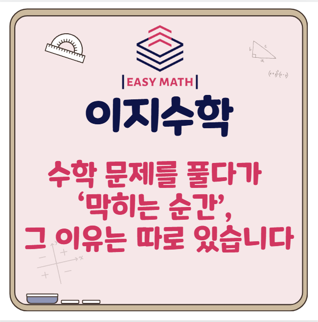 안녕하세요. 안산단원구수학학원 이지수학입니다. 수학 공부를 하다 보면 누구나 한 번쯤 문제를 풀다가 갑자기 멈춰버리는 순간을 경험하게 됩니다. 분명 앞부분은 잘 풀고 있었는데 어느 지점에서 더 이상 풀이가 이어지지 않는 상황입니다. 많은 학생들이 이때를 단순히 “어려운 문제라서”라고 생각하지만, 실제로는 그보다 더 구체적인 원인이 존재하는 경우가 많습니다. 수학 문제에서 막히는 가장 큰 이유는 ‘풀이 방향이 보이지 않기 때문’입니다. 이는 단순히 문제 난이도의 문제가 아니라, 어떤 개념을 적용해야 하는지 떠올리지 못하는 상태를 의미합니다. 즉, 개념을 알고 있는 것과 실제 문제에서 활용할 수 있는 것은 전혀 다른....... <img src="https://blogthumb.pstatic.net/MjAyNjA0MTdfNTQg/MDAxNzc2NDEyMzg3Mjk0.ovvA26FO7xAuC2CbgzhVmC-O2F26KlOxrvCXStX6QGIg.rGHxzLllYtK4wtPd4htYh6NKgt7BhfPiHrV2c5p1iFcg.PNG/image.png?type=s3" />