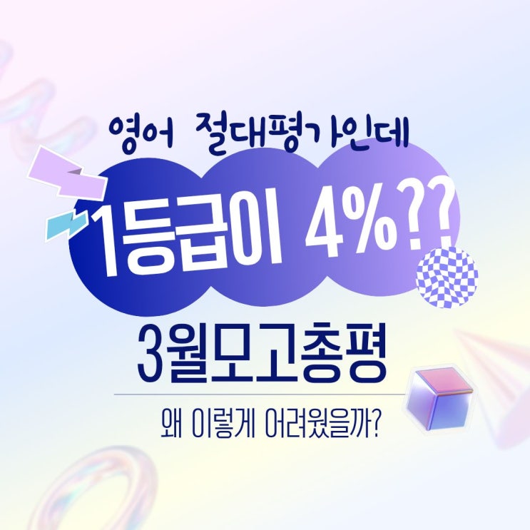 안녕하세요, 김기준영어학원입니다 이번 3월 전국연합학력평가 영어 결과, 다들 어떻게 받아들이고 계신가요? "90점만 넘으면 1등급"이라는 절대평가의 취지가 사실상 사라진 수준이에요. 상대평가 과목인 국어(4.67%), 수학(4.11%)과 거의 차이가 없거든요. 절대평가라는 말만 믿고 영어를 뒤로 미루면 안 되는 이유가 바로 여기 있어요. 37번 문제 하나만 봐도 알 수 있어요. 우주 공간의 팽창 원리를 다룬 지문, 단어 수만 190개에 내용은 완전 학술 논문 수준이에요. 한국어로 읽어도 이해하기 어려운 내용을 영어로 읽고 단락 순서까지 배열해야 합니다. 주어진 시간은 고작 2분 남짓. 고난도 3종은 문제를 많이 풀어서 올라....... <img src="https://blogthumb.pstatic.net/MjAyNjA0MTVfMjI4/MDAxNzc2MjE5ODc3MTk1.a8jsGBvr2x3j9mTBX-A9xMXQ_LQKzNXgH77gHSVAcxsg.QQBc-060V8roy1ACPol8Vf7HJD9LSGktHngcjtHMN6Mg.JPEG/1.jpg?type=s3" />
