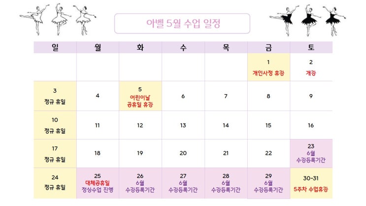 ♡ 안녕하세요 ♡ #아벨무용학원 입니다. (교육청 등록번호: 하남 제144 호) 날씨 변덕이 심하지만 낮에는 따뜻한 햇살에 꽃향기로 물든 봄을 느껴볼 수 있는 요즘입니다~ 오늘 5월 일정과 시간표를 안내해드립니다. 5월 일정표 개강 5월 2일 토요일 종강 5월 29일 금요일 5월 1일(금) 원장 선생님 부재 휴강 & 5월 5일(화) 공휴일 휴강 5월 25일(월) 대체 공휴일 정상 수업 진행 5월 30일~31일 5주차 휴강 5월 시간표 색으로 표기된 수업들이 오픈되어 진행중인 수업이며, 모집중으로 적힌 수업은 아직 미오픈 된 수업입니다. 4월 22일 수요일부터 5월 재등록기간 이오니 재등록 원하시면 수업 전 후....... <img src="https://blogthumb.pstatic.net/MjAyNjA0MjJfMTE2/MDAxNzc2ODUxNzk0MDkz.D5zDOJXPhZs5HCHXFN8MSXElQ-R3uN-ViE0CHjGVrhog.k6txhexzFGRz_HetDZpM62L2_DocccfB5MHH-0HiZmog.JPEG/5%BF%F9_%C0%CF%C1%A4%C7%A5.jpg?type=s3" />