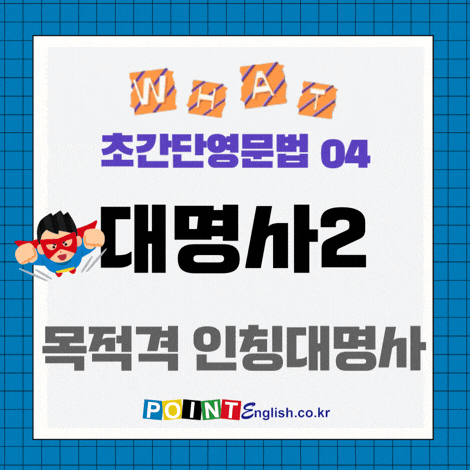 완전기초 영문법 04. 대명사 2 - 목적격 인칭대명사, 초등학생, 영어문법 최초 입문자용 안녕하세요. 여러분의 영어 궁금증을 해결해 드리고, 영어 실력 향상에 도움을 드리고픈 포인트영어입니다. 오늘은 지난 주의 주격 인칭대명사에 이어서 두 번째, 목적격 인칭대명사를 배워 보겠습니다. 지난주에는 가장 기초적인 형식으로 문장을 만들 수 있었다면 오늘은 조금 더 문장 같은 문장을 만드는 연습을 할 수 있습니다. 1. 대명사 - 목적격 인칭대명사 1) 목적격 대명사란? · 목적어는 문장의 술부에 위치합니다. · 목적어는 다른 단어(동사, 전치사)의 동작이나 작용의 대상이 되는 말입니다. · 목적어는 ‘~을’, ‘~를’이라고 번역합니다. ....... <img src="https://blogthumb.pstatic.net/MjAyNjA0MDhfMTM5/MDAxNzc1NjM0NTYxMjQ1.tty7WLW0HZySXkvqJaPoucD5VPNPTYray6N6WLs9lfEg.WBdLsKhM0Cy58v57XNcXnvd_02H4ZHEhatEO1NAckAkg.GIF/%C3%CA%B0%A3%B4%DC%BF%B5%B9%AE%B9%FD04.%B4%EB%B8%ED%BB%E7-%B8%F1%C0%FB%B0%DD.gif?type=s3" />
