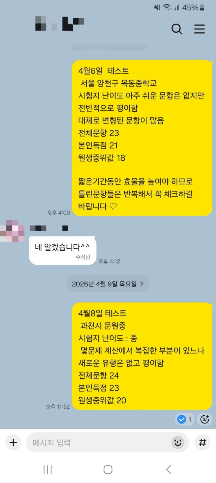 안녕하세요^^ 곧 1학기 중간고사가 시작되죠! 저희 [수학에 닿다]도 시험을 위해 열심히 준비 중인데요, 시험은 무엇보다 스스로의 준비가 중요합니다!! 지금부터 어떻게 준비하느냐가 결과를 바꿉니다! 시험 기간이 다가오면 많은 아이들이 “문제를 많이 풀어야 한다”고 생각합니다. 하지만 수학은 단순히 양으로 해결되는 과목이 아닙니다. 어떻게 준비하느냐에 따라 점수 차이는 크게 달라집니다. 오늘은, 수학 점수를 올리는 핵심 준비 방법을 정리해드립니다 1️⃣ 범위 전체를 ‘한 번 정리’하는 것이 먼저입니다! 문제를 풀기 전에 가장 먼저 해야 할 것은 시험 범위 개념 정리입니다. 공식만 외운 상태인지 개념을 설명할 수....... <img src="https://blogthumb.pstatic.net/MjAyNjA0MTVfMzkg/MDAxNzc2MjU3MjU1NTYw.Kbe4w_iEzp4v90YDVGjVkLq-QuZIYWAoK0GVgAcbgMAg.f89l2wiJwjZSqB2vgRKxWCuQAEzYtMvolK6TA9chcx4g.PNG/900_file_000000006f94720b8899c1392999cca3.png?type=s3" />