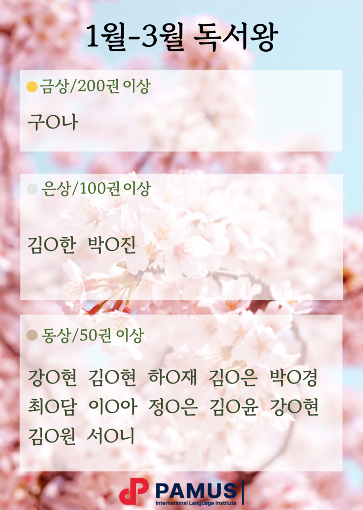 Hello, Reading Stars ✨ 안녕하세요, 파머스 국제어학원 죽전본원입니다 벚꽃이 한창인 4월, 설레는 소식을 들고 왔어요! 지난 1월부터 3월까지 온라인 도서관을 통해 영어 원서를 열심히 읽어준 우리 학생들의 1분기 독서왕 시상식을 진행했습니다. 주 2권 필수 과제를 꾸준히 지키고, 어떤 학생들은 그 몇 배를 훌쩍 넘기도 했는데요. 성실하게 읽고, 단어 공부하고, 퀴즈 풀고, 직접 목소리로 낭독까지 해낸 우리 학생들에게 뜨거운 박수를 보냅니다! 수상자 한 명 한 명 모두 정말 자랑스럽습니다. 사진 속 환한 미소가 그 노력을 대변해주는 것 같아요 Certificate of Excellence 상장과 함께 리워드 카드, 독서왕 배지도 함....... <img src="https://blogthumb.pstatic.net/MjAyNjA0MTZfMjUg/MDAxNzc2MzI0NjY3NTk1.a3nt6Ppdio4dtSxz2HFf7CD5blCOiBBEQasiY2vnsBAg.ZaTgGeWMWVtl21ypBf1rfFJfSLrGrdsYuvp32l6f94Mg.PNG/%B5%B6%BC%AD%BF%D5-%C6%F7%BD%BA%C5%CD-002.png?type=s3" />