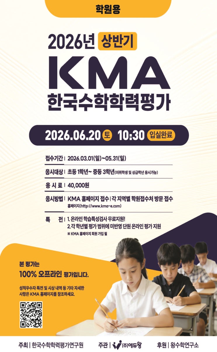 ✨2026년 상반기 KMA 응시 접수✨ ✅시험일: 2026년 6월 20일(토) ✅시험시간: 10:30까지 입실 완료 - 초1~2: 11:00~12:00 (60분, 25문항) - 초3~중3: 11:00~12:30 (90분, 30문항) ✅시험장소: 강남대학교 ✅응시료: 40,000원 ✅응시 접수 - ‘접수 신청’ 클릭 - 신청서 작성 ✔️대비 교재 및 특강 신청 - 응시 접수 신청서 작성 시 선택 ⭐️대비 특강 초4 – 6/6(토) 14:00~17:00 초5 – 6/6(토) 10:00~13:00 초5 – 6/11(목) 19:10~21:40 초6 – 6/7(일) 14:00~17:00 [응시 접수] <img src="https://blogthumb.pstatic.net/MjAyNjA0MjBfNjkg/MDAxNzc2NjY4MzEzNDQw.4NQq-cGr75reZs2auj0nkzEJCGBqrLsZZz_YjiLLD58g.ttzwahvYBHQhwCHaPK-c3hQutolppapfqqY5xZgd-Z0g.JPEG/2026_%BB%F3%B9%DD%B1%E2_%BA%EA%B7%CE%BD%B4%BE%EE-%C7%D0%BF%F8%BF%EB%28%BA%D0%C7%D2%C6%E4%C0%CC%C1%F6%29_%C6%E4%C0%CC%C1%F6_1.jpg?type=s3" />