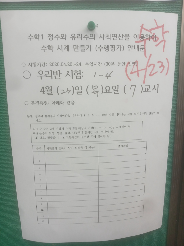 동백중1 수학 수행평가 수학시계 만들기 모범 답안입니다. 제이탑 학생 들이 동일한 답을 쓰면 채점하는 과정에서 불이익이 생길 수 있으니 예시 모범 답안을 참고하여 자기만의 식을 만들어서 수행평가 시간에 제출하길 바랍니다~ <img src="https://blogthumb.pstatic.net/MjAyNjA0MjFfODkg/MDAxNzc2NzcwNDk2NDkx.cm09gWRVLqjkz6rvTxH6DCm-tvFDtELWCEEa4kY3Me8g.2o3WH6Iequ3jxztGxwMrXOGOhOI7YdxFWgHa-N_0COQg.PNG/image.png?type=s3" />