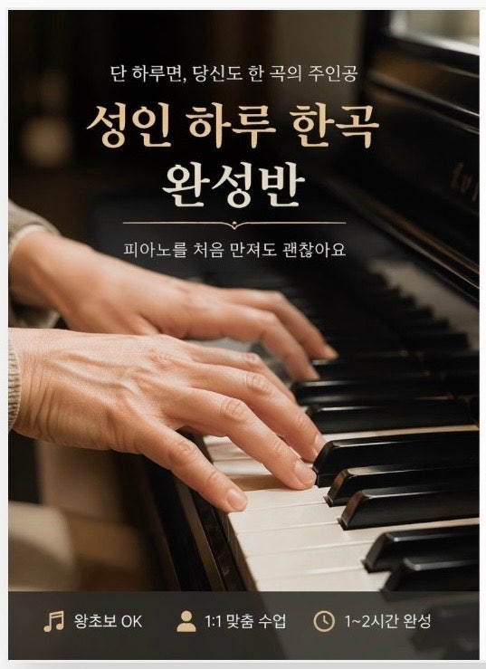 요즘 상담 오신 분들의 이야기를 듣다보면, “피아노… 배우고 싶었는데 너무 늦은 걸까요?” 이 질문, 정말 많이 듣습니다. 하지만 결론부터 말씀드리면 전혀 늦지 않았습니다. 요즘은 긴 기간 배우지 않아도 단 하루로 ‘한 곡 완성’하는 클래스가 있습니다. "악보 못 봐도 괜챦아요. 단 하루면, 당신의 첫 연주가 완성됩니다." 하루 한곡 완성반이란? 성인을 위한 맞춤 프로그램으로 악보를 몰라도, 피아노를 처음 만져도 ✔ 한 곡을 끝까지 연주할 수 있도록 ✔ 개인 속도에 맞춰 1:1로 진행되는 수업입니다. 실제 수업은 이렇게 진행됩니다 1️⃣ 곡 선택 (쉬운 곡부터 시작) 2️⃣ 핵심 패턴만 빠르게 익히기 3️....... <img src="https://blogthumb.pstatic.net/MjAyNjA0MjJfMzAw/MDAxNzc2ODQyOTM2NTI1.xb-zb8qqLR5fVrnb3nROdmqTYE1mu7HnnBt48-7SamIg.ZTHmNwGCz72L8pWPe9xuGrdX0-kB5hunoMYLojOb9C4g.JPEG/KakaoTalk_20260422_162731254.jpg?type=s3" />