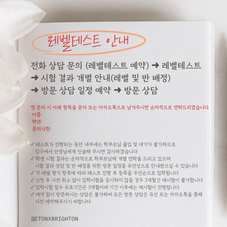 1️⃣ 상담 문의 (유선) 학부모님의 전화 상담을 통해 프로그램 전반에 대한 안내와 함께 레벨테스트 일정이 예약됩니다 2️⃣ 레벨테스트 진행 학생의 현재 영어 실력을 정확히 파악하기 위해 체계적인 레벨테스트가 진행됩니다 ⏱ 소요시간: 약 40~50분 3️⃣ 시험 결과 개별 안내 (유선) 레벨테스트 종료 후 결과를 개별적으로 안내드리며 학생의 수준에 적합한 레벨 및 반 배정을 함께 안내드립니다 4️⃣ 방문 상담 일정 예약 (유선) 방문 상담이 필요한 경우 방문 상담은 사전 예약을 통해 일정이 조율됩니다 5️⃣ 방문 상담 (예약제) 예약된 일정에 맞춰 방문하시면 학생의 학습 방향 및 커리큘럼에 대해 보다 심층적으로 상담해드립니다....... <img src="https://blogthumb.pstatic.net/MjAyNjA0MTRfMTcx/MDAxNzc2MTU5ODczNDUx.NuOiE4qI4Cqi-Q6wWGO78rSIHctXP-ixsmVYGuCjF34g.L-GfMY3VnHI9PbWus9ULSs-3cKjCGSCiaEszG0qXfysg.JPEG/%BA%A3%C0%CC%C1%F6_%BD%C9%C7%C3%C7%D1_%BC%B3%B3%AF_%B8%ED%C0%FD_%BF%AC%C8%DE_%C5%C3%B9%E8_%B9%E8%BC%DB_%BE%C8%B3%BB_instagram_%B0%D4%BD%C3%B9%B0.jpg?type=s3" />