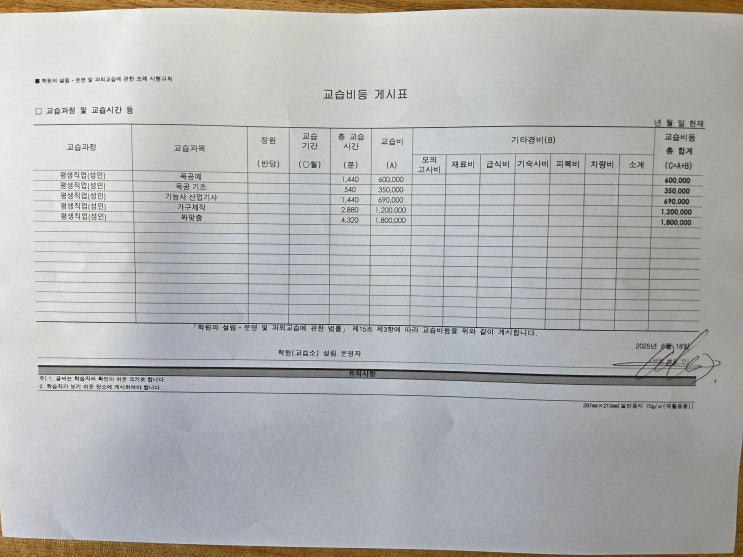 에벤에셀목공학원 교습비 게시표