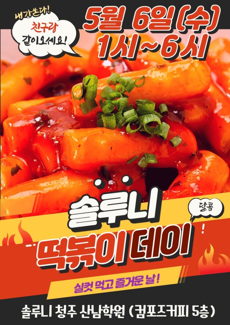 어린이날 기념 솔루니 떡볶이 데이♡ 솔루니 떡볶이가 돌아왔어요^^ 한번 맛보면 잊을 수 없는 그맛!! 일시: 5월 6일 수요일 오후1시~6시 장소: 솔루니 청주 산남학원 (컴포즈커피 5층) 친구와 함께 오면 양이 두배^^ 친구야 내가 쏜다!! 맛있게 먹고 즐겁게 공부하는 솔루니♡ 곧 만나요^^ 인증샷도 기대돼요♡ #솔루니산남학원#솔루니떡볶이데이#어린이날#5월#어버이날#인증샷#떡볶이파티#산남동독서논술#산남동솔루니학원#산남동국어학원#중등국어내신#중등내신전문#중등국어공부#초등국어#대교솔루니 <img src="https://blogthumb.pstatic.net/MjAyNjA0MjlfMjYx/MDAxNzc3NDUxMTEyNTM2.YIeii-Go-X3wtxyTQuWo6yM9LRhvumhzRm9VFURVI14g.znQFNyjOFxoNRqshyhXjrusL_yV93KCCsMSWG5leSAIg.JPEG/1776672162744.jpg?type=s3" />