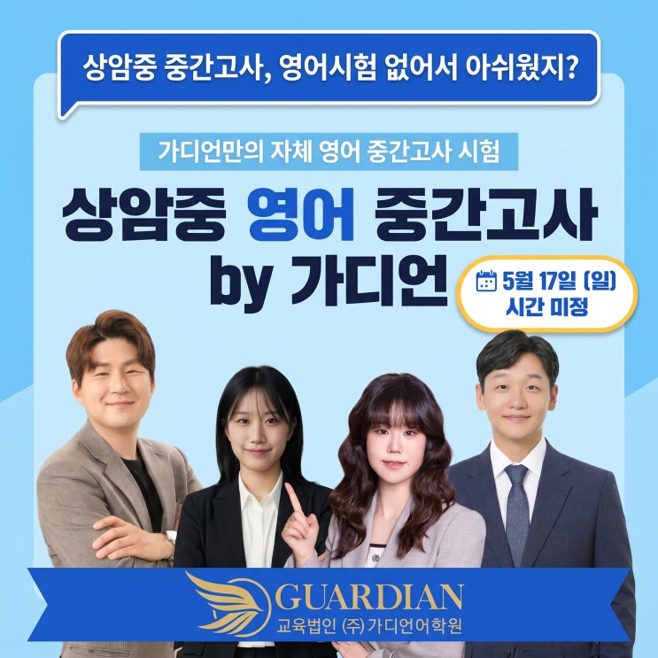 안녕하세요, 가디언어학원입니다. 이번 상암중학교 1학기 중간고사가 마무리되었습니다. 국어, 수학, 사회, 과학… 모든 과목의 시험을 치르며 아이들도, 학부모님들도 정말 고생 많으셨습니다. 그런데 한 가지, 아쉬운 점이 있으셨을 거예요. "이번 중간고사에 영어 시험이 없네…?" "우리 아이 영어 실력이 지금 어느 정도인지 어떻게 확인하지?" 영어는 한 번 흐름을 놓치면 다시 따라잡기 어려운 과목입니다. 특히 중간고사에서 영어 시험이 빠지면, 객관적인 실력 진단의 기회 자체가 사라져 버리죠. 기말고사까지 그대로 두고 가시면, 그때는 이미 늦습니다. 그래서 가디언이 준비했습니다 가디언어학원의 노하우를 모....... <img src="https://blogthumb.pstatic.net/MjAyNjA0MzBfMTU2/MDAxNzc3NTMzMzQ3MTc0.Dgkhm57jJ5SkKL6pXVrIVpaS-Gpd80o93Px5IVVVUz0g.FxCCmSV49Gar0s-XST725D4m1FSd00dc9wW3ea-MG08g.JPEG/KakaoTalk_20260430_144835849.jpg?type=s3" />