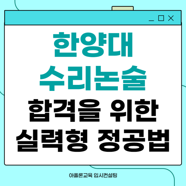 한양대 수리논술, 합격을 위한 정공법은 무엇일까? 안녕하세요, 대치 아폴론교육입니다. 지난 칼럼에서 성균관대 수리논술이 가진 '제시문의 유기적 연결'과 '설계 능력'의 중요성을 짚어보았습니다. 오늘은 성균관대와 전혀 다른 경향으로 문제를 출제하는 한양대학교 논술전형을 분석합니다. 2027학년도 한양대학교 논술전형 개요 한양대학교는 2027년 논술전형으로 총 232명(계약학과 포함) 의 학생을 모집하며, 그중 인문계열 46명, 상경계열 29명, 자연계열 152명을 선발합니다. 의학계열은 8명을 논술전형을 통해 선발합니다. 한양대학교 논술전형의 요소별 반영비율은 기존의 논술전형 90%+서류평가 10%에서 올해부터....... <img src="https://blogthumb.pstatic.net/MjAyNjA0MjlfMTk2/MDAxNzc3NDYyMzk4MDk3.mgEfMMr4RZa2qcFdqkfH4AtsfOGQdHC8Ve-cE0CAPesg.2kfzRDXmOmXZEB58wxS9drQaW0omHdx5anGH7OjazUQg.PNG/%BA%ED%B7%CE%B1%D7_%BD%E6%B3%D7%C0%CF%28%B0%A1%C0%CC%B5%E5%BC%F6%C1%A4X%2C_%C6%E4%C0%CC%C1%F6_%BA%B9%BB%E7%BB%E7%BF%EBO%29-012_%281%29.png?type=s3" />