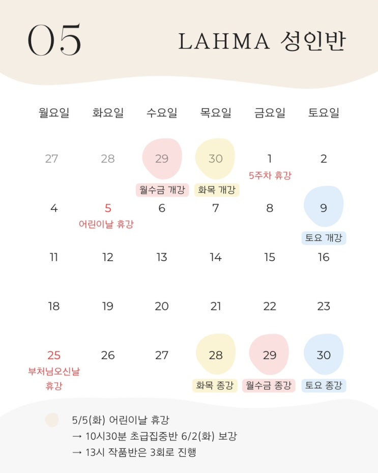안녕하세요 라마발레학원입니다. 따뜻한 계절, 몸과 마음을 함께 깨우는 5월 성인 발레 수업 일정 안내드립니다 수강에 참고하실 수 있도록 자세히 안내드리니 확인 부탁드립니다. 월·수·금 수업 (총 12회) 4월 29일 개강 ~ 5월 29일 종강 5월 1일(금) 근로자의 날 휴강 5월 25일(월) 부처님 오신 날 대체공휴일 휴강→ 개강일 조정으로 보강 진행됩니다. 화·목 수업 (총 8회) 4월 30일 개강 ~ 5월 28일 종강 5월 5일(화) 어린이날 휴강 ✔ 오전 10:30 초급집중반→ 6월 2일(화) 보강 진행 ✔ 오후 13:00 작품반→ 총 3회 수업으로 진행됩니다. 토요 수업 (총 4회) 5월 9일 개강 ~ 5월 30일 종강 5월은 공휴일로 인해 일....... <img src="https://blogthumb.pstatic.net/MjAyNjA0MjhfMTUx/MDAxNzc3MzcxNzM0Njgw.KJ7LMA7ms06qb3sCvID7pmd8oHg_JMdPPPUamoLB58og.3Xj4G-OxUWSqAuyeqHukZMbatOIN6Ti5sNnmDtGsy5Eg.JPEG/IMG%A3%DF0376.JPG?type=s3" />