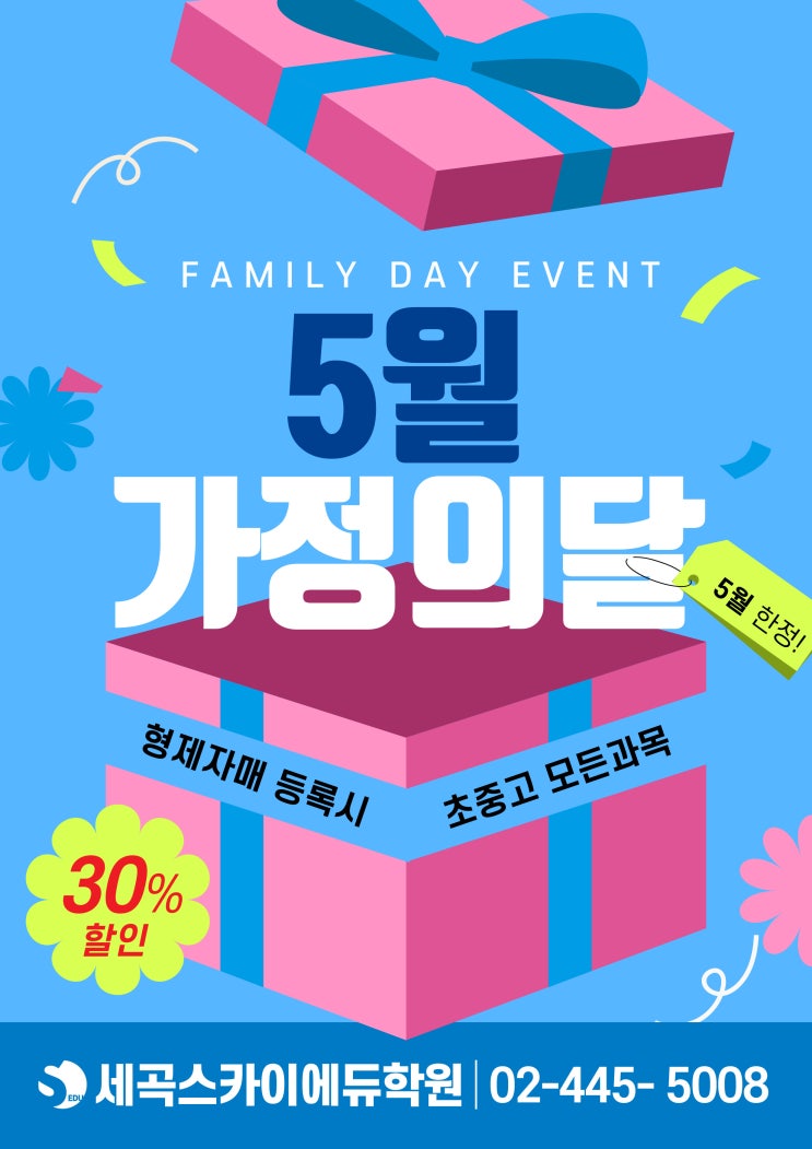 안녕하세요. 세곡동 학생들의 내신을 책임지고 있는 세곡스카이에듀 학원입니다. 두둥~탁!! 가정의달 이벤트 형제자매 등록시 할인이벤트를 소개해드립니다. 또한 세곡스카이에듀에서는 초등 교과반, 중, 고등부 내신 대비반에 상시 입반 가능하니 언제든 많은 상담 문의 부탁드립니다! 세곡동 학생들의 내신을 책임지고 있는 세곡스카이에듀 학원 세곡스카이에듀 학생이라면 누구나 참여가능!! ◎ 이벤트기간 | 5월말까지 ◎ 이벤트 내용 | 형제, 자매 등록시 _ 초,중,고 모든 과목 1개월 30% 할인 * 타이벤트와 중복 할인 적용 불가 세곡스카이에듀는 개별 성향과 실력에 맞춤 수업 / 개인 맞춤 문제풀이가 이루어지는 개별 정규 수업으로 보다....... <img src="https://blogthumb.pstatic.net/MjAyNjA0MjFfMTY3/MDAxNzc2NzUxNTY1MjY5.-cmqn5PUEPIB9jdFTaxxXnTr3M4EHLwngtBOOx6AbLsg.lSzVS_66R3SZ5AoxNNe1PbRvsoIACf3UHjU2F4yJJeog.JPEG/%C4%A3%B1%B8%BC%D2%B0%B3-%C0%CC%BA%A5%C6%AE-004.jpg?type=s3" />