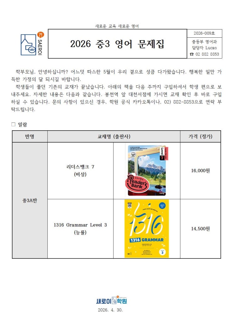 안녕하세요, 새로이학원입니다. 중간고사 강행군이 드디어 완료되고 따뜻한 5월이 다가왔습니다. 그동안 공부하느라 정말 고생 많으셨습니다. 이제 한숨 고르면서 다시 기초 다듬을 때가 되었네요. 기존에 하던 교재가 다 끝나가니 새로운 책을 준비하여 주세요. 봉천역 앞 대천서점에 가시면 바로 구입하실 수 있습니다. 5월에도 잘 부탁드립니다! <img src="https://blogthumb.pstatic.net/MjAyNjA0MzBfNTgg/MDAxNzc3NTIzNTU3NzI0.EyCyVYze-VMqLE0A2UuKJD1fKQEN8wRMLd51pEFDiHAg.hNpxLpyuZi6VtL_kTzEZcnf9YWCldxp8-kTaFREXHwUg.JPEG/%28009%29_2026_%C1%DF3_%BF%B5%BE%EE%B1%B3%C0%E7_%BE%C8%B3%BB001.jpg?type=s3" />
