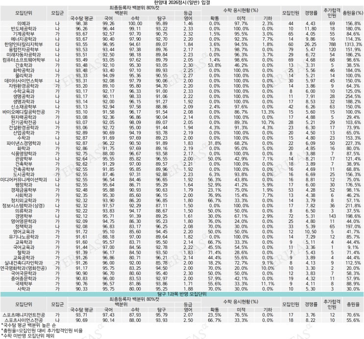 오랜만에 올리는 입시 정보입니다. 팔은 안으로 굽는다고...가장 먼저 올리는 대입결과는 모교인 한양대학교입니다. 정시 입결은 특별할게 없지만, 이번에는 80%커트라인을 공개 했구요. 예년에 비해 소폭 상승한 걸로 보여집니다. 많은 분들이 오해하시는게 재수생이 늘어서 입결이 올라간게 아니냐고 하시는데... 꼭 그렇지 만은 않구요. 재수생들의 성적대에 따라 입결은 달라집니다. 극상위권(메디컬)의 재수생들이 그리 많지는 않은 것으로 보이며, 인 서울 대학에 대한 선호 현상이 조금 더 강세였던 것으로 보여집니다. 올해도 비슷한 흐름으로 이어질것으로 보이는데...2등급과 3등급 컷 사이에서 경쟁이 매우 치열하지 않을까 생각해봅....... <img src="https://blogthumb.pstatic.net/MjAyNjA0MzBfMTAw/MDAxNzc3NTE0Nzg1MTM0.4VbtYTmUnhOO8_U72IBxCO4q59evTiMHKCer86RQx10g.DIXG4cWirElowyWLOPfWhYwi2O6ja5EYFbHH4M1go_sg.JPEG/607975_521301_1925.jpg?type=s3" />