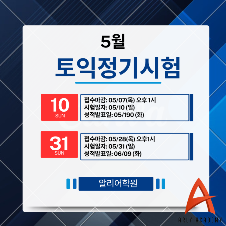 안녕하세요.^^ 김해 삼계동 토익전문학원 알리토익입니다. 5월은 대학생, 취업준비생, 졸업예정자, 편이비 준비생, 공무원 준비생, 직장인 모두에게 토익 점수 관리가 중요한 시기입니다. 특히 여름방학 전 목표 점수를 만들어 두고 싶은 분들이라면 5월 정기토익 일정을 꼭 확인하셔야 합니다. 2026년 5월에는 토익 정기시험이 총 2회 시행됩니다. 시험일, 접수 마감일, 성적 발표 일을 미리 확인하시고 목표 점수에 맞춰 준비해 보세요. 아래 일정은 TOEIC 공식 시험 일정 기준입니다. 5월 10일 시험은 이미 정기 접수가 마감된 뒤 특별추가 접수 기간에 해당하며, 5월31일 시험은 정기접수 기간이 남아 있습니다. 접수 마감 시간이 보통 오후....... <img src="https://blogthumb.pstatic.net/MjAyNjA0MzBfMTg5/MDAxNzc3NTE1MzE2NzI1.QKdmGLOVM4dXMCb5wZtkvMWYi82egVIVOlbMZGM6yLQg.29HBRMhmF4tKtwo4BU_pkMOyfhSHOTFBPsjbBds-XOcg.PNG/%BE%CB%B8%AE%BE%EE%C7%D0%BF%F8_%2831%29.png?type=s3" />