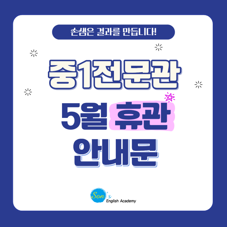 손샘영어 중1전문관 5월 공휴일 휴관 안내 드려요 ~! 5월 휴관 일정 • 5/1(금) 노동절 및 5/5(화) 어린이날 : 휴관 * 5/4(월) : 월목반 정규 수업 복귀일 *5/8(화) : 화금반 정규 수업 복귀일 휴관 기간 동안에는 전화 상담 및 방문 결제가 어려운 점 양해 부탁드립니다. 4월 내신 기간 동안 열심히 학습한 중1전문관 친구들 모두 고생 많았어요 ♥ <img src="https://blogthumb.pstatic.net/MjAyNjA0MjlfMTQ2/MDAxNzc3NDQ1MTAyMDk3.fRs3GDrktxsddlz5WeOLRZSXjzjesDKKWT5C6h2L9Ugg.PdPuaC7nGJtEjQjKTWdpmPbjvq_lfh-uUYv_7544spog.PNG/%C1%DF1%C0%FC%B9%AE%B0%FC_%BA%ED%B7%CE%B1%D7%BF%EB-_%BA%B9%BB%E7%BA%BB_%281%29.png?type=s3" />