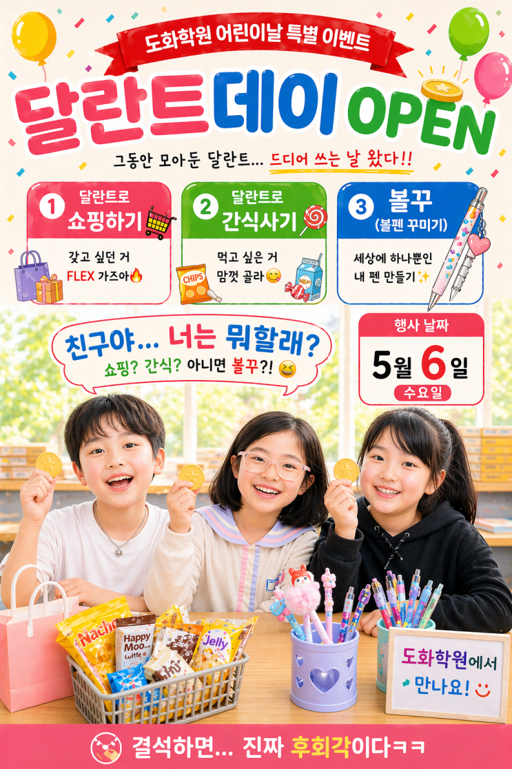 5월 6일 단 하루✨ 도화학원 달란트파티 OPEN! 우리 아이들 그동안 모은 달란트로 원하는 선물로 바꾸는 찐 꿀잼 날 ✔ 친구들이랑 같이 놀고 ✔ 선물도 받고 ✔ 추억까지 챙기는 날 이건 솔직히… 안 오면 손해각 결석 금지! 무조건 참석 필수 도화학원 5월 6일 #도화동학원 #도화동공부방 #서화초공부방 #초등공부습관 #초등국어수학 #웅진씽크빅 #스마트올 #초등AI학습 #초등신학기준비 #도화동초등학원 <img src="https://blogthumb.pstatic.net/MjAyNjA0MjRfMjc5/MDAxNzc3MDE1OTY3NTc4.mlTcWuokLcDbk_7taiuA2oilV6llmbf_KB4u_xpdyGgg.A0HxFiG6Y-uXrYCArsPlkZN2aucl2npfnMTbUcc6Vnkg.PNG/%B5%B5%C8%AD%C7%D0%BF%F8%B4%DE%B6%F5%C6%AE.png?type=s3" />