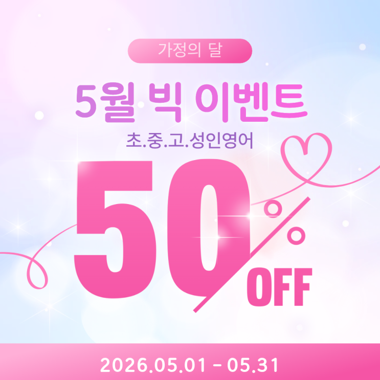 6개월 등록시 + 6개월 50% 할인 영어학원 3년 다녀도 말 못하는 이유, 알고 계세요? 문제만 풀면, 절대 말 못합니다. 이제 '읽기' 말고 '말하기'로 바꿔보세요. #성인영어, 공부 오래 했는데, 말이 안 나오시나요? 영어로 한 문장도 말 못한다면 지금이 마지막 기회입니다. "5월 가정의 달, 빅 이벤트" ▶ 가정의 달 이벤트: 3개월 등록시 10% 할인 ▶ 6개월 결제 시 6개월 50% 할인 - 일 년 치 공부, 반값으로 끝내세요. ☞ 5월이 지나면 사라지는 역대급 혜택! ▶ 가족이 함께하면 혜택도 두 배! 형제.자매 동시 등록 시 추가 10% 할인의 기회 ▶ 지인 추천 감사 이벤트: 기존 수강생이 친구를 추천해 등록하면....... <img src="https://blogthumb.pstatic.net/MjAyNjA0MjZfMTg4/MDAxNzc3MTYzOTA3NjU4.gXo_VDkffU_7Qr8_blyaUHVUKre9-7wb6ef5UfMq7yEg.nB48qsQ0gzuXzPPjenNdnQzL-3pFdAumuJUtU6qyEjAg.PNG/%C1%A6%B8%F1%C0%BB_%C0%D4%B7%C2%C7%D8%C1%D6%BC%BC%BF%E4._%2817%29.png?type=s3" />