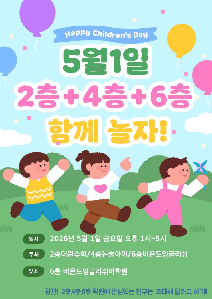 안녕하세요!비욘드잉글리쉬 원당캠퍼스입니다. 11년동안 한자리에서 아이들의 성장을 지켜보며 늘 고민했습니다. "어떻게 하면 우리 아이들이 더 즐겁게, 그리고 완벽하게 배울 수 있을까?" 그 고민의 해답을 찾기 위해 드디어 원당동 교육 전문가들이 손을 맞잡았습니다. 2층 더원수학 + 4층 논술아이 + 6층 비욘드잉글리쉬 실력은 기본, 아이들을 향한 진심까지 닮은 세 학원이 '교육연합'을 결성했습니다! 그 첫 번째 시작으로, 다가오는 어린이날을 맞아 우리 아이들을 위한 특별한 하루를 선물하려 합니다. 5월 1일(금), 6층이 통째로 놀이터가 됩니다! 공부할 때 누구보다 뜨거웠던 우리 아이들, 이날만큼은 누구....... <img src="https://blogthumb.pstatic.net/MjAyNjA0MjdfMjk3/MDAxNzc3Mjk0MzMxNTI5.2ACiaVHjMkmMVOCK0_LfCHZzhm3UNTVWFvWjwhAStmcg.afnjOl-J8V_fmOfHb_1poEujlANgNpyTERkh0SJ6uvYg.JPEG/%C1%A6%B8%F1%C0%BB_%C0%D4%B7%C2%C7%D8%C1%D6%BC%BC%BF%E4._%2826%29.jpg?type=s3" />