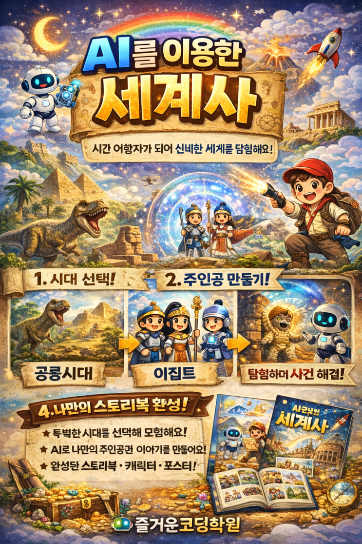 AI로 떠나는 시간 여행! 우리 아이가 “직접 만드는 세계사 이야기” 요즘 아이들에게 단순히 외우는 공부는 점점 의미가 줄어들고 있습니다. “왜?” “어떻게?” “내가 만들어볼까?” 이런 질문과 경험이 더 중요해지고 있습니다. 그래서 준비했습니다. ✨ AI를 이용한 세계사 창작 수업 ✨ AI 세계사, 뭐가 다를까요? 이 수업은 단순한 역사 공부가 아닙니다. ✔ 시대를 선택하고 ✔ 주인공을 만들고 ✔ 사건을 만들어 ✔ 나만의 이야기로 완성합니다 즉, “배우는 역사”가 아니라 “만드는 역사”입니다 이렇게 진행됩니다 1️⃣ 시대 선택 공룡시대 / 이집트 / 중세 / 미래 등 2️⃣ 나만의....... <img src="https://blogthumb.pstatic.net/MjAyNjA0MTlfNTEg/MDAxNzc2NTQwODMxMzg2.ownCTgTF-RrdJ59tLsXHx0TVXtD2Bbmb4BrUl1CR-ZIg.4QOcp0PEl6LEM3UwjAYP_w6pf7x82WmtbkD1Z-4isy4g.PNG/%BC%BC%B0%E8%BB%E7%B8%B8%B5%E9%B1%E2.png?type=s3" />