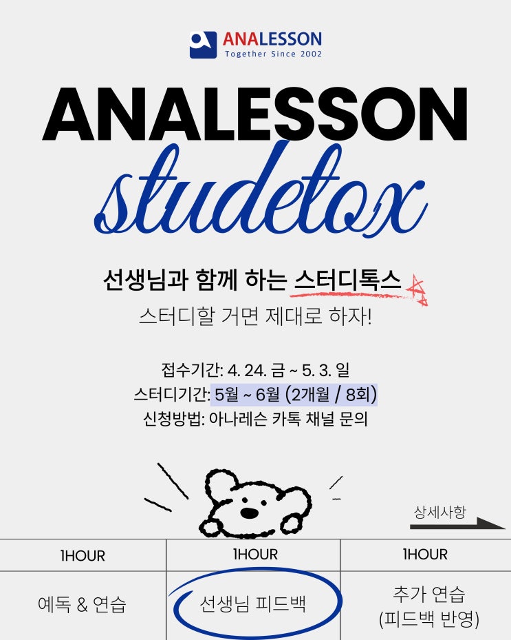 아나레슨의 ‘스터디톡스’ 3기 모집을 시작합니다! 앞서 진행된 스터디톡스 참여자 분들이 정말 좋은 반응을 보내주셨습니다 ㅎㅎ 특히 1:1 수업처럼 꼼꼼하게 진행되는 원장님의 케어에 만족하셨어요! 그동안 막연하게, 설렁설렁 스터디를 이어오셨다면 이제는 시간 낭비를 줄이고, 명확한 목표와 체계적인 커리큘럼 속에서 선생님의 피드백을 통해 실력을 확실하게 끌어올려 보세요. ‘스터디톡스’는 대표 원장이 직접 관리하고 점검합니다. 성실하게, 꾸준히 참여할 의지가 있는 아준생이라면 누구나 지원 가능합니다. 두 달 동안 ‘스터디톡스’와 함께 건강한 성장의 변화를 경험해보세요 ! 신청기간: 4월 24일(금) ~ 5월 3일(일) 신청방....... <img src="https://blogthumb.pstatic.net/MjAyNjA0MjRfMTkg/MDAxNzc2OTk3MzA2NDA3.5aXJAtD5F0Yhc8cLHpfoUrfweqbEjj4Ro-RsjKQHI5cg.EsNuEiv78hpd6-crN0VaLYxmRNyji0bZCSf94rbsO9cg.JPEG/001.jpg?type=s3" />