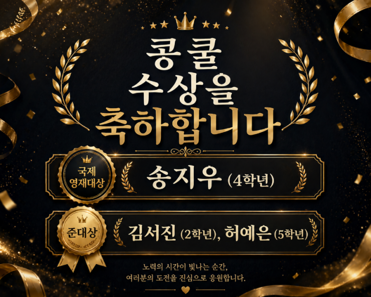 콩쿨 입상을 축하합니다 우리 친구들이 이번 콩쿨에서 정말 멋진 결과를 만들어냈어요 무대 위에서 빛나는 순간 뒤에는 아이들의 꾸준한 노력과 시간들이 있었습니다~ 때로는 어렵고 힘들었을 연습의 시간들을 묵묵히 이겨내고, 끝까지 최선을 다해준 우리 아이들 열심히 연습한 만큼 좋은 결실을 맺어서 더 뿌듯합니다 국제영재대상 송지우 (4학년) 준대상 김서진 (2학년) 허예은 (5학년) 끝까지 포기하지 않고 노력한 우리 아이들 너무 자랑스럽습니다 앞으로의 성장도 기대해주세요✨ 항상 응원해주시는 학부모님들께도 감사드립니다 <img src="https://blogthumb.pstatic.net/MjAyNjA0MjZfMTAx/MDAxNzc3MjAzMzAyNjcz.FNiE6M_JlAnDrBpzxllHw0zRxJoVUFgFHK2Ggpklmq4g.FZgWSgZwFSLLAHSjBo9j-RzlR00KQjaAxJHJqhWy30Yg.PNG/900_1777202866813.png?type=s3" />