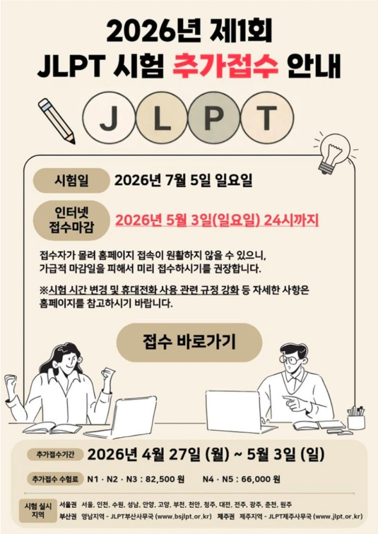 JLPT 추가접수 5월3일(일)까지 입니다~ 아직 접수 못하시는 분들은 꼭~!! 접수하세요 유카리일본어학원 02-595-1582 #기초일본어 #기초회화 #원어민강사 #JLPT #유카리일본어학원 <img src="https://blogthumb.pstatic.net/MjAyNjA0MjZfMTEz/MDAxNzc3MTc1MTcyMjYz.Uc0MSuqW7gB7-R79h_GIWF8Ke9faJQby9uRFWRHAwGgg.xY6s8cHJclFrlp7WdRCFeK7daky4RDmReNzP7bhv6wkg.JPEG/900_Screenshot_20260424_181056__.jpg?type=s3" />